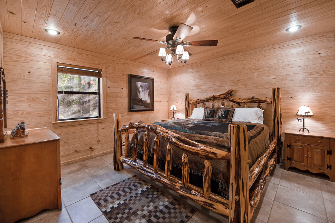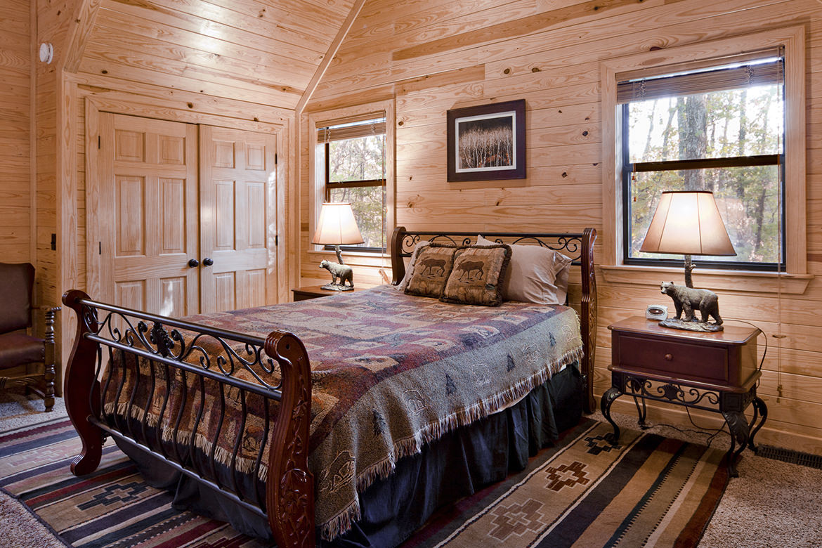 Big Bear, Broken Bow Cabins, is designed to sleep 7 comfortably, but is roomy enough to add an air mattress or two for kids or additional guests. The main level features 2 bedrooms, a full size bathroom, and a laundry area with washer & dryer. The bedrooms have a King bed in one and two full sized beds in the second. The large loft is furnished with a queen bed and a twin sleeper sofa along with a full private bath. Each bedroom is comfortably furnished and decorated to fit the forest environment. Luxury bedding highlights each room. Having a family gathering or retreat, this cabin is neighboring Stevens Springs Lodge (Link) a 15 acre secluded getaway, and other select Hidden Hills Cabins.