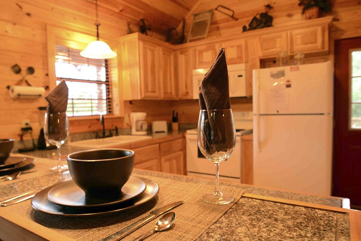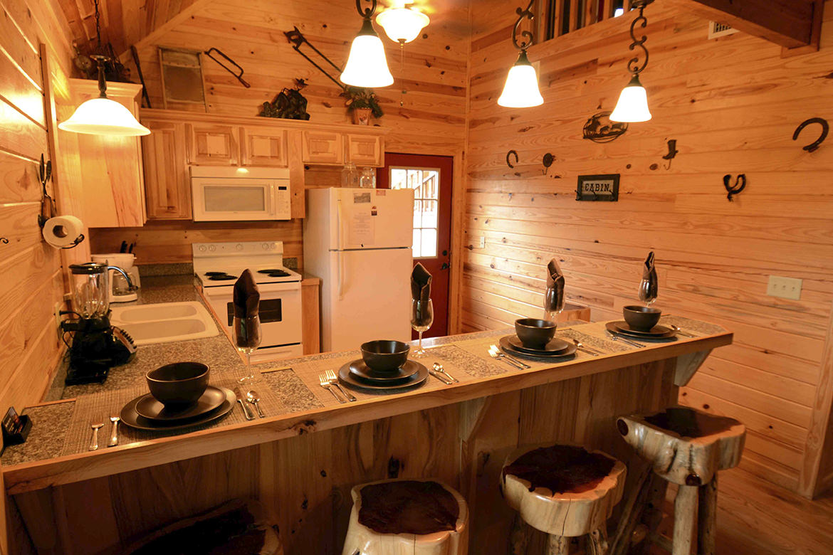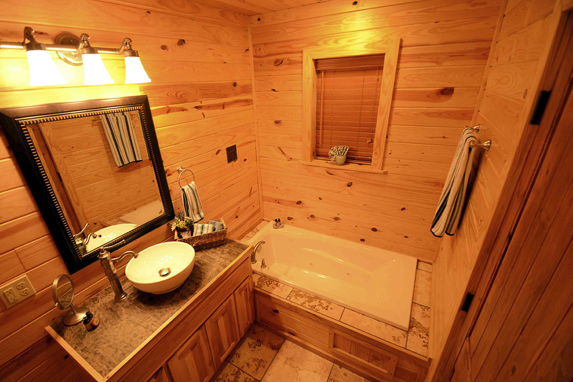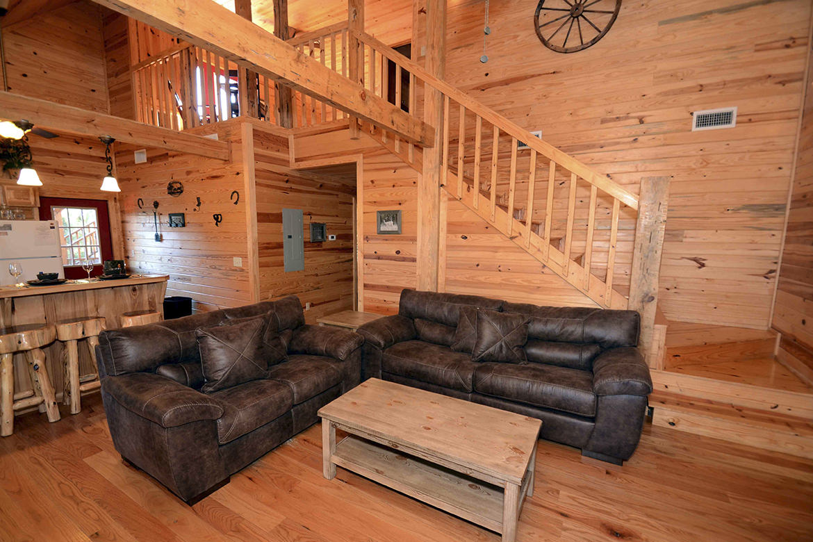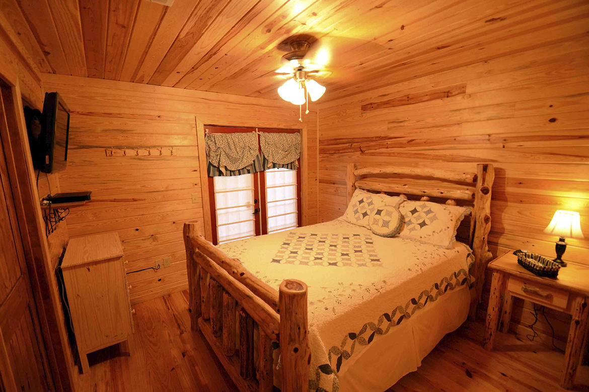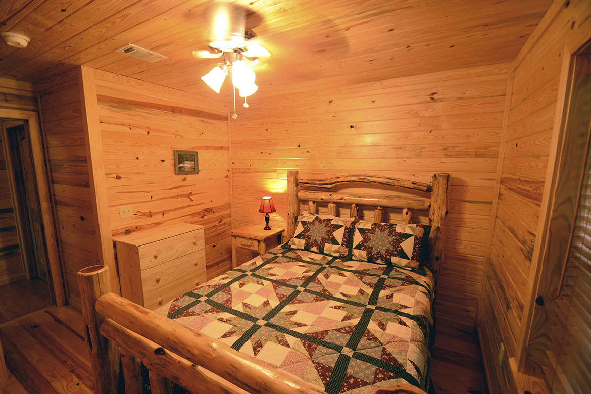 This Broken Bow Cabin is fully furnished with 2 queen size log beds on the main level and 2 sets of bunk beds for the kids upstairs. The master suite has French doors leading to the patio/spa and a whirlpool tub in the master bath. Both living areas have big screen HDTV’s. The main living area is furnished with a large sectional and ottoman to rest your feet while watching TV and enjoying a fire in the fireplace.