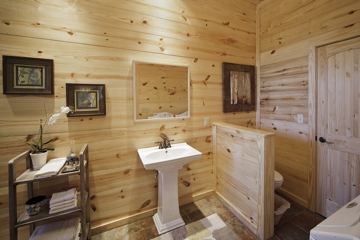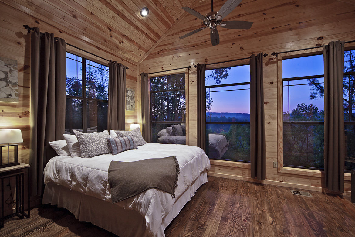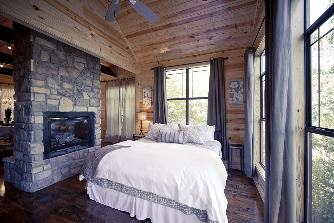 Step inside Mount Mystic cabin and it’s hard to believe you’ve left the outdoors with large windows surrounding you on all sides. This open floor plan cabin showcases a large double sided gas fireplace that separates the living area from the bedroom and can be enjoyed from both rooms. Sleek modern rustic furniture and accessories adorn the cabin in style.